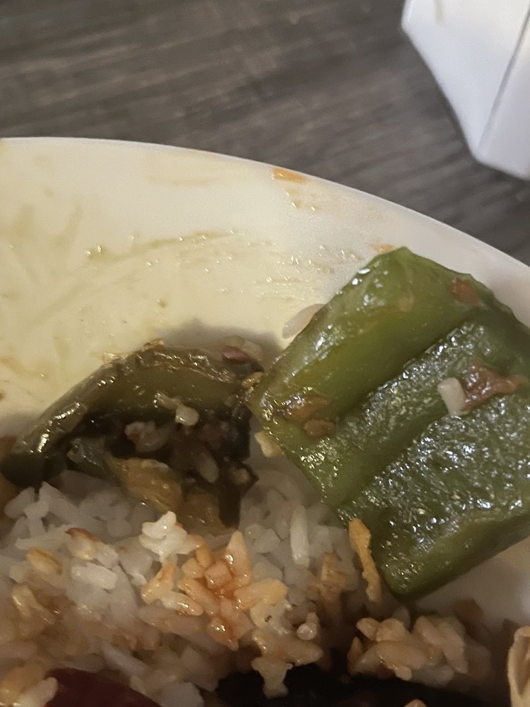 Diced chicken stir-fried with green and red bell peppers, onions, typically includes a savory black pepper sauce.